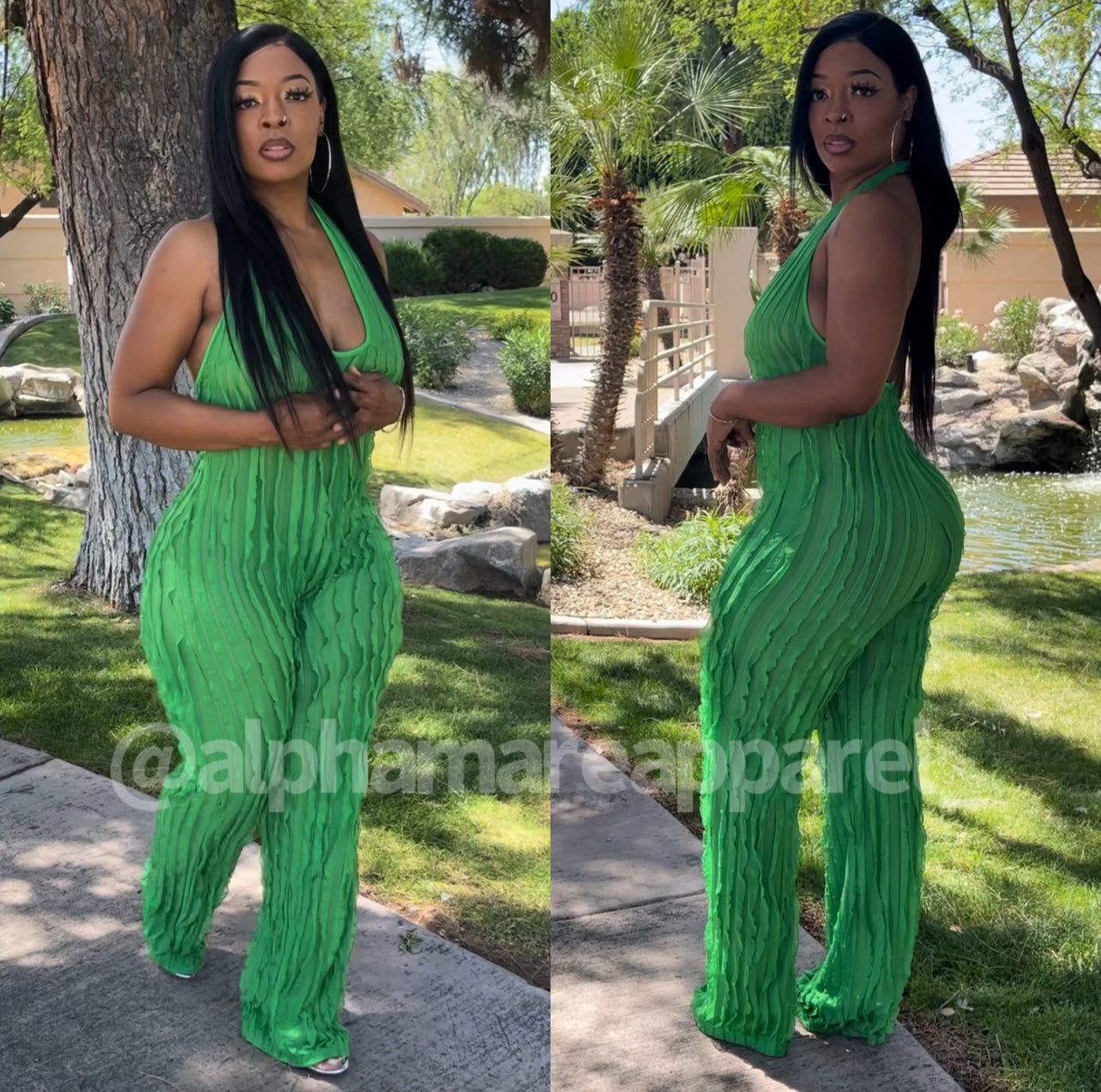 JAMILA V Cut Halter Fringed Green Jumpsuit